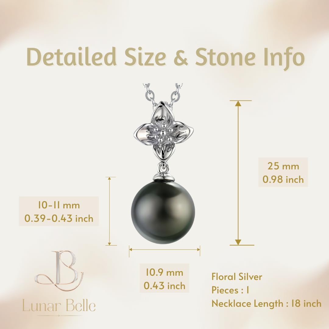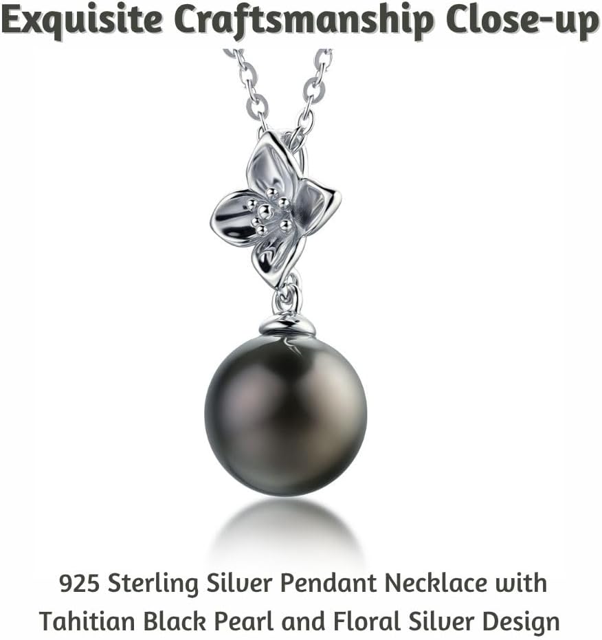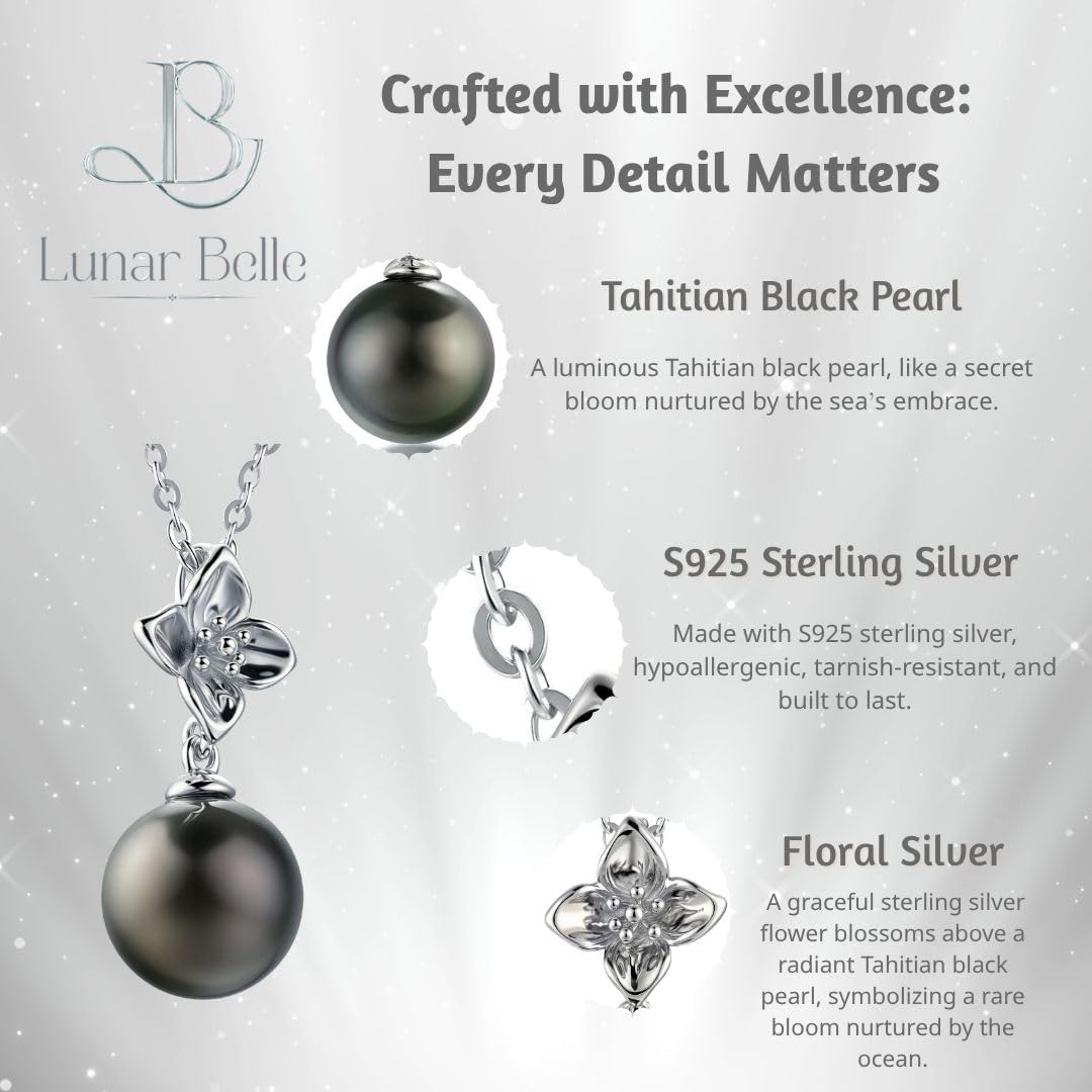 Lunar Belle Tahitian Black Jewelry Pearl Pendant Necklace in Sterling Silver, Luxury Wedding Christmas Gift for Women Mother Wife (Marine Fleur)